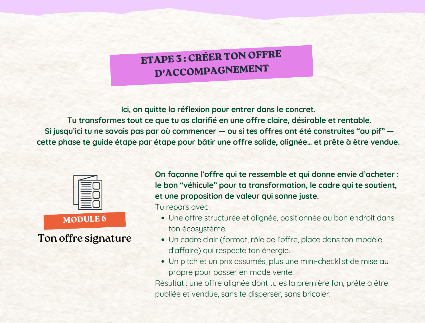 Tu ne proposes plus “des séances” ou “des accompagnements” : tu as une offre signature claire, positionnée, magnétique — une offre qui te ressemble vraiment, qui honore ta manière naturelle d’aider, et qui attire tes clientes d’âme parce qu’elle vibre juste.