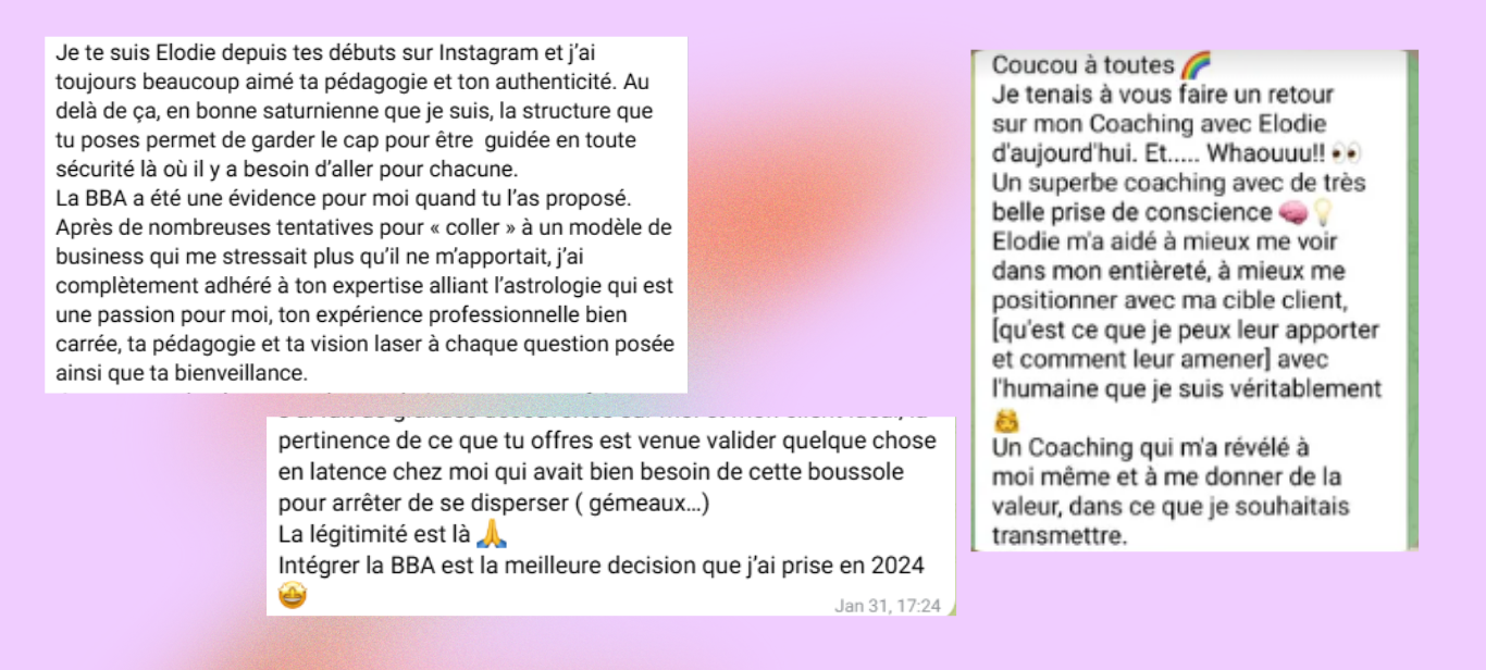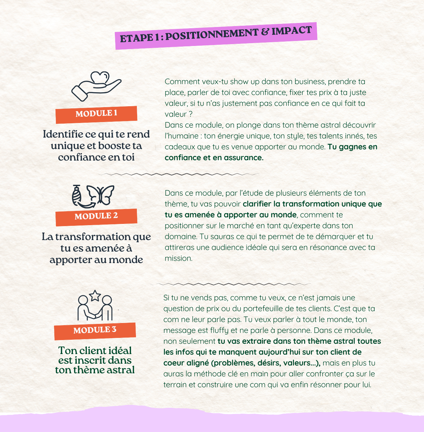 6 modules vidéos + fiches astro + stratégies concrètes pour te guider pas à pas dans la construction de ton business signature.