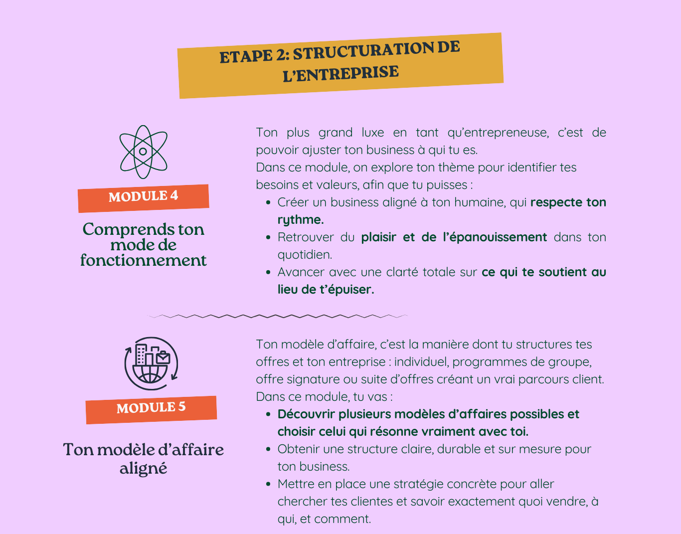 Un parcours pensé pour te guider, module après module, vers un business clair, aligné et puissant.